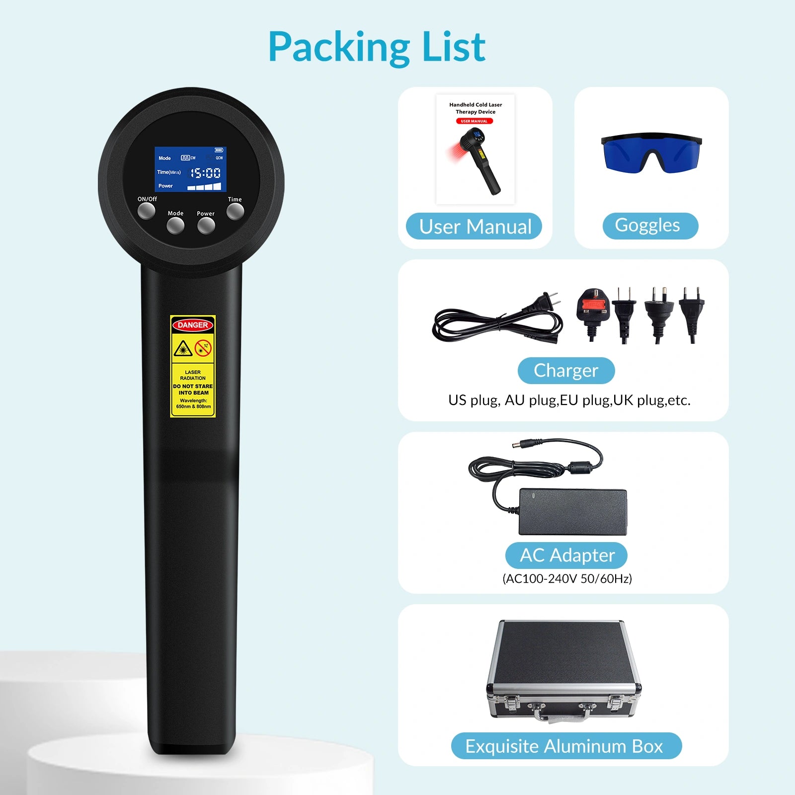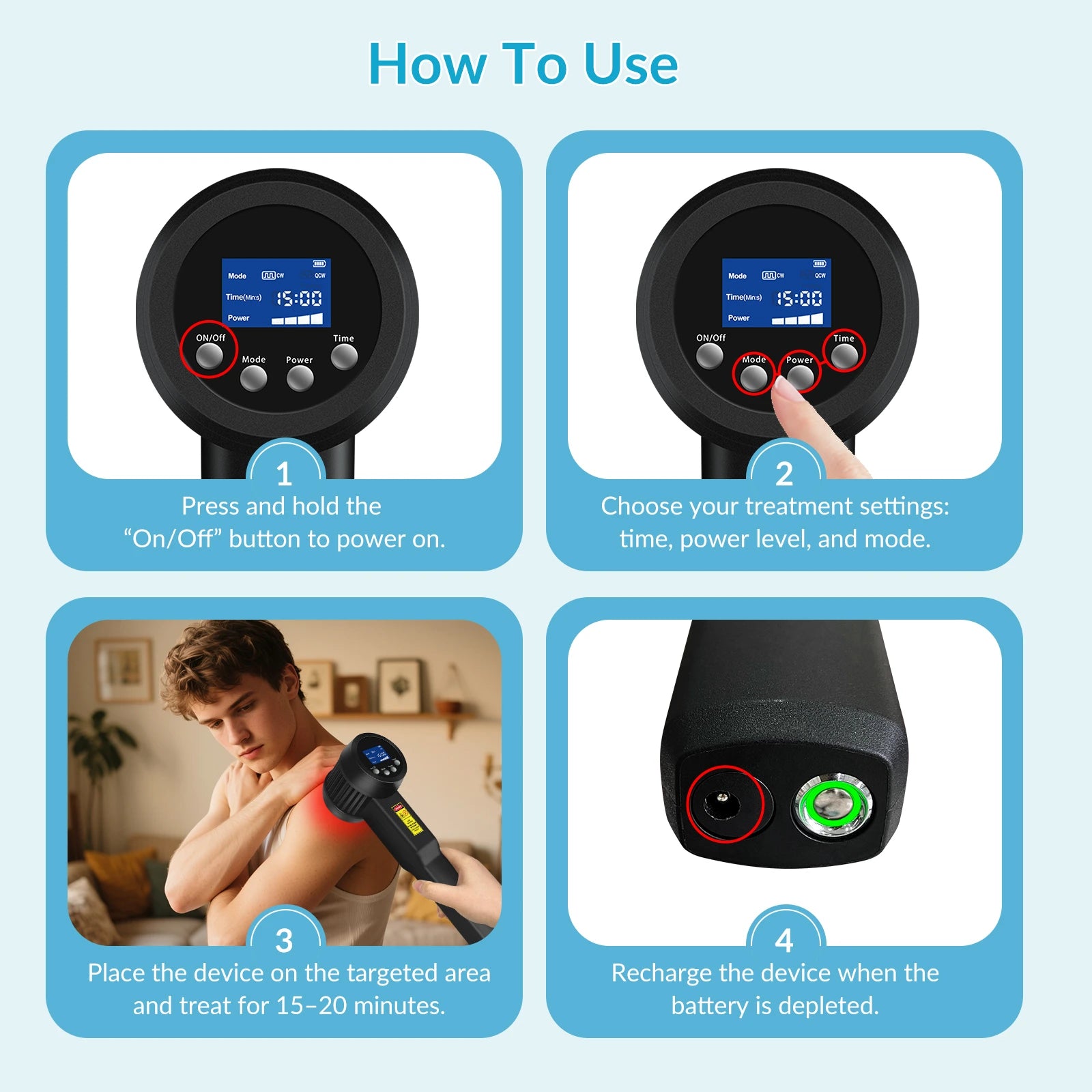 • Powerful Laser Therapy Device: Equipped with 25 high-performance diodes, this device offers flexible combinations of 650nm, 808nm, 905nm, and 980nm wavelengths. Adjustable output power from 3W to 12W allows targeted treatment for various needs, ensuring optimal intensity and effectiveness.