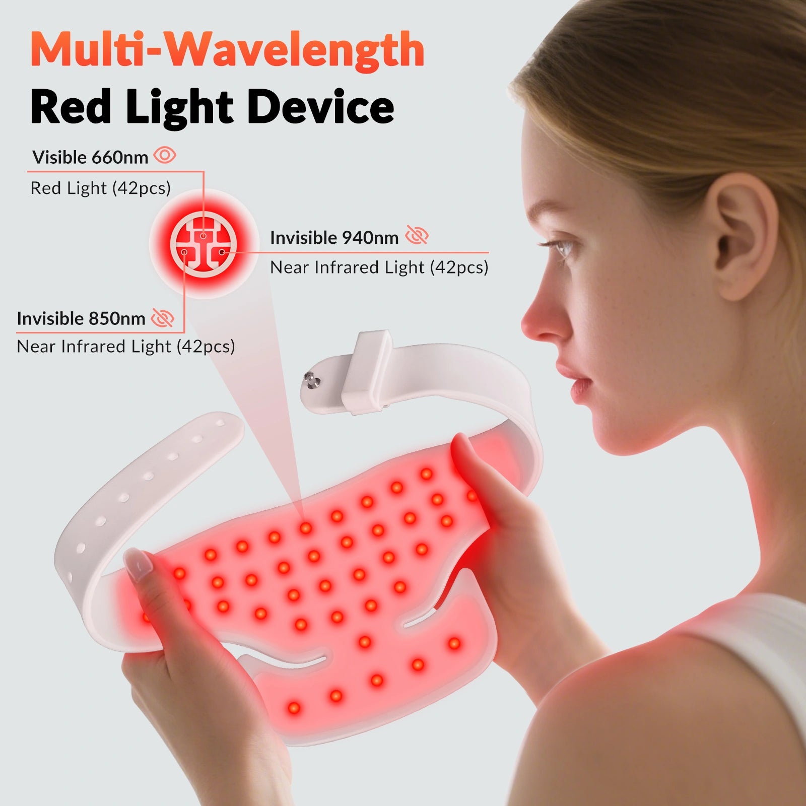 Our Infrared Therapy Neck Device features a triple-wavelength LED bead that emits three precisely calibrated red light wavelengths, which have been validated through practical applications. Different red light wavelengths vary in their ability to penetrate, and the 3-in-1 LED chip integrating these three wavelengths delivers more powerful light energy, deeper penetration, stronger irradiation, and more favorable outcomes.